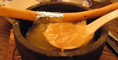 Seperti menu utama berupa sup sirip hiu, dengan kaldu yang dimasak selama 10 jam. Namanya, Classic Superior Shark's Fin in Supreme Broth with Crispy Spring Roll disajikan dalam stone pot ala Jepang. Anda seperti menikmati hidangan hotplate namun bedanya hidangan ini tersaji dalam mangkuk batu yang berfungsi mengatur suhu. Sejak awal disajikan, hingga suapan terakhir, Anda masih bisa menikmati kehangatan sup yang terasa segar dan gurih ini.